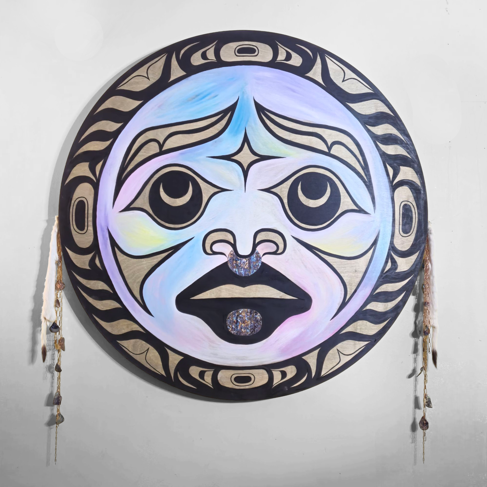 Embelished with copper, abalone, ermine, and filled with a colourful vibrancy that represents the supernatural energy the moon carries. My full moon is a rich moon and it honours my accomplishments and the artist I have become.